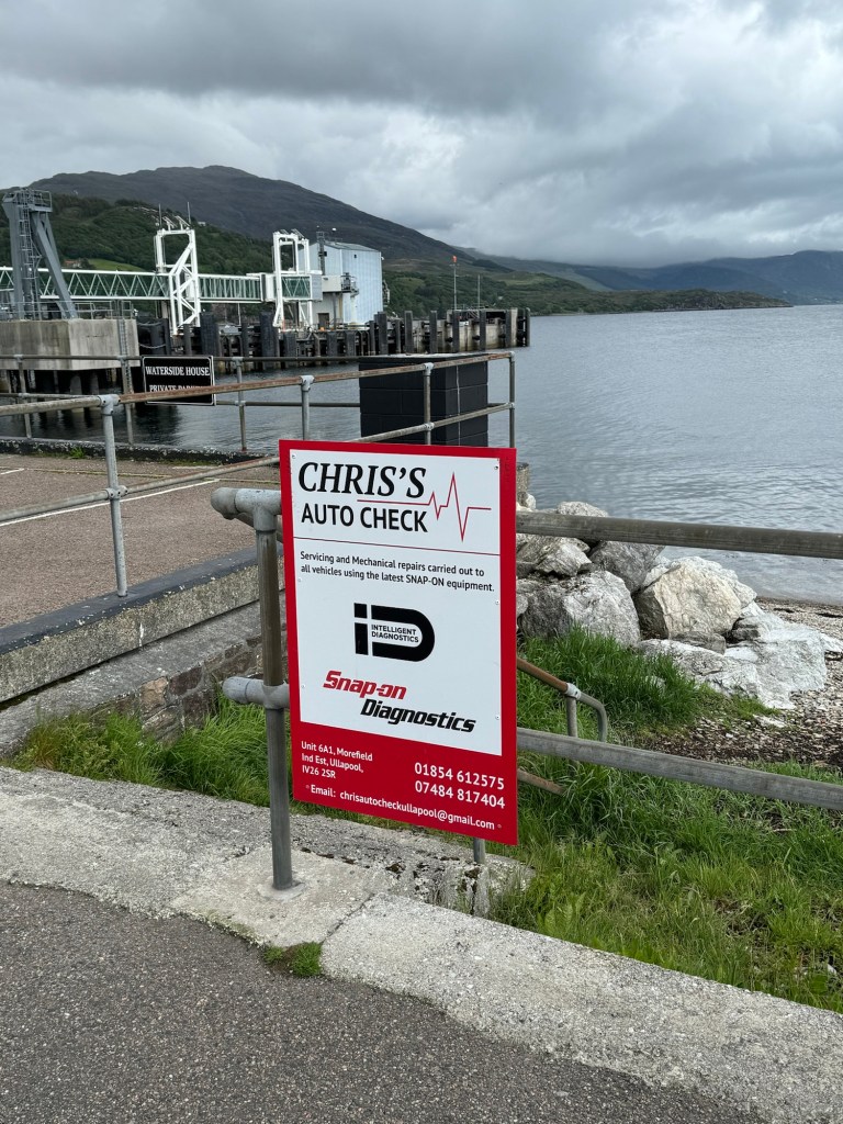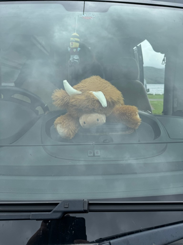 It didn’t look good. As suspected new discs and pads needed. We spent a few hours looking round the shops (to be fair that doesn’t take long in Ullapool) we did however purchase a new van mascot to accompany Bertie Bee (Up The Clarets) who we have named Hamish the Highland coo..